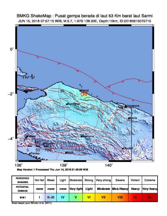 Tmbhn info Gempa Mag 5.7 SR, 15-Jun-18 07:57:15 WIB, Lok:1.97 LS-138.93 BT (di darat, 63 km BaratLaut SARMI-PAPUA),Kedlmn: 10km, drskn di Sarmi IV MMI ::BMKG