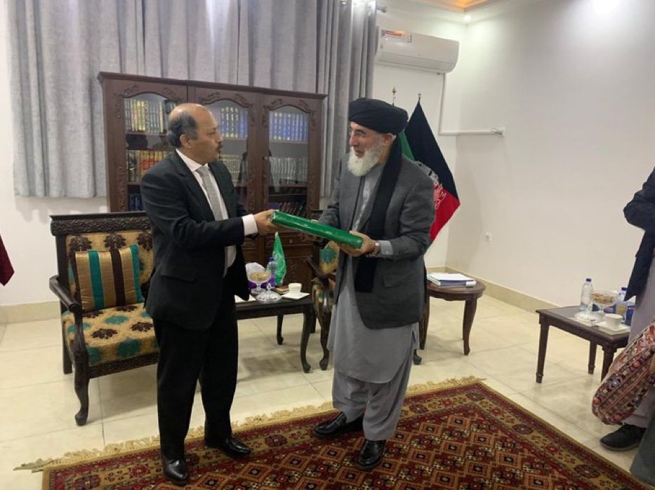 په کابل کې د پاکستان سفیر له جهادي قومندان ګلبدین حکمتیار سره لیدلي. کومه ډالۍ یې هم ورکړې. کور یې ودان حساس وخت کې یې تپوس کړی.pic.twitter.com/kbwiDIsSnC
