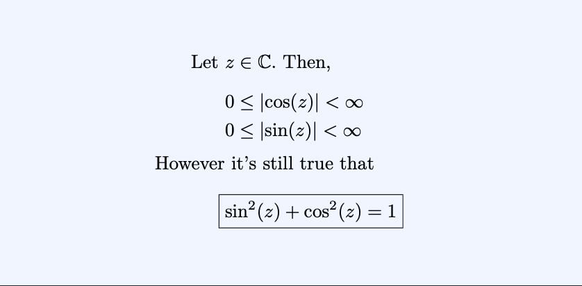 In the complex plane, sine & cosine are no longer bounded. However, the relation we all know and love still survives.pic.twitter.com/IJmNMHvWVm
