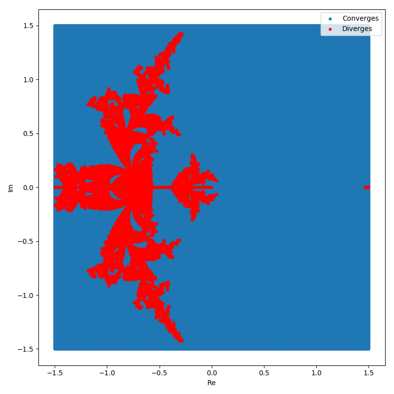 I've gotten different python graphs but yours is probably more accurate. Need to check it later sometime and compare with you! How are you determining convergence and divergence? And your doing a linspace thing to get points?