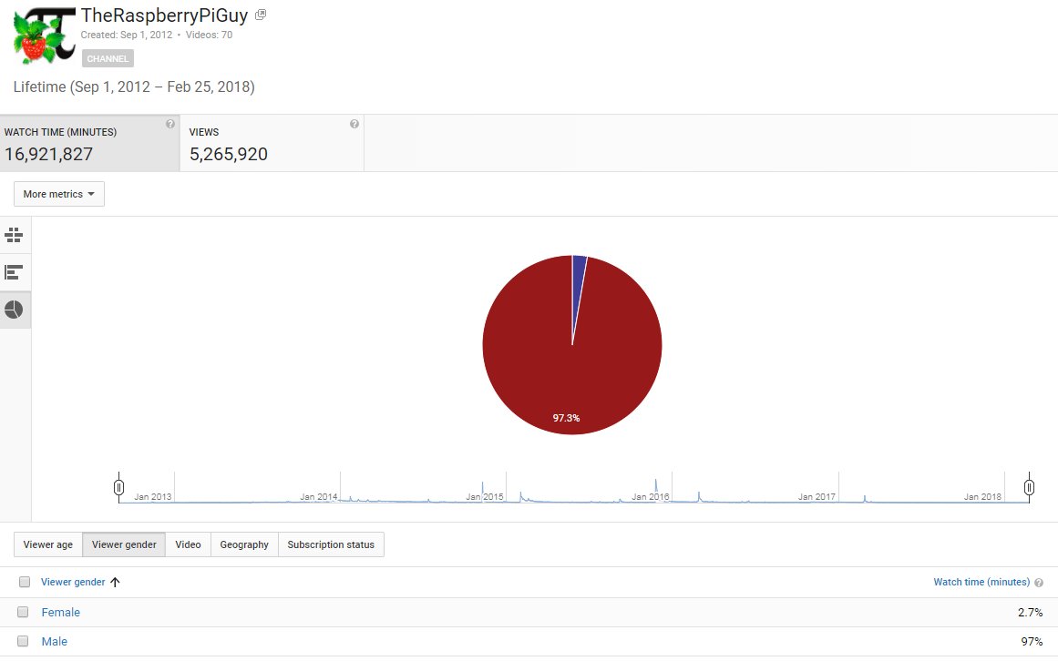 You should see the state of my gender analytics on my YouTube videos! I know that at the moment, the tech industry is still very much male dominated, but is it really a 97% domination?!pic.twitter.com/f5rrcPWQQo