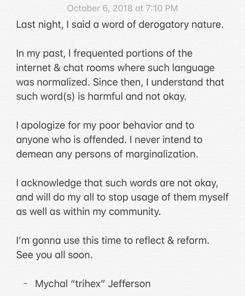 For clarification: it was the slur f-bomb directed toward a mutual on his own stream. Here’s a link to his apology.https://twitter.com/trihex/status/1048759176304848896?s=20 …