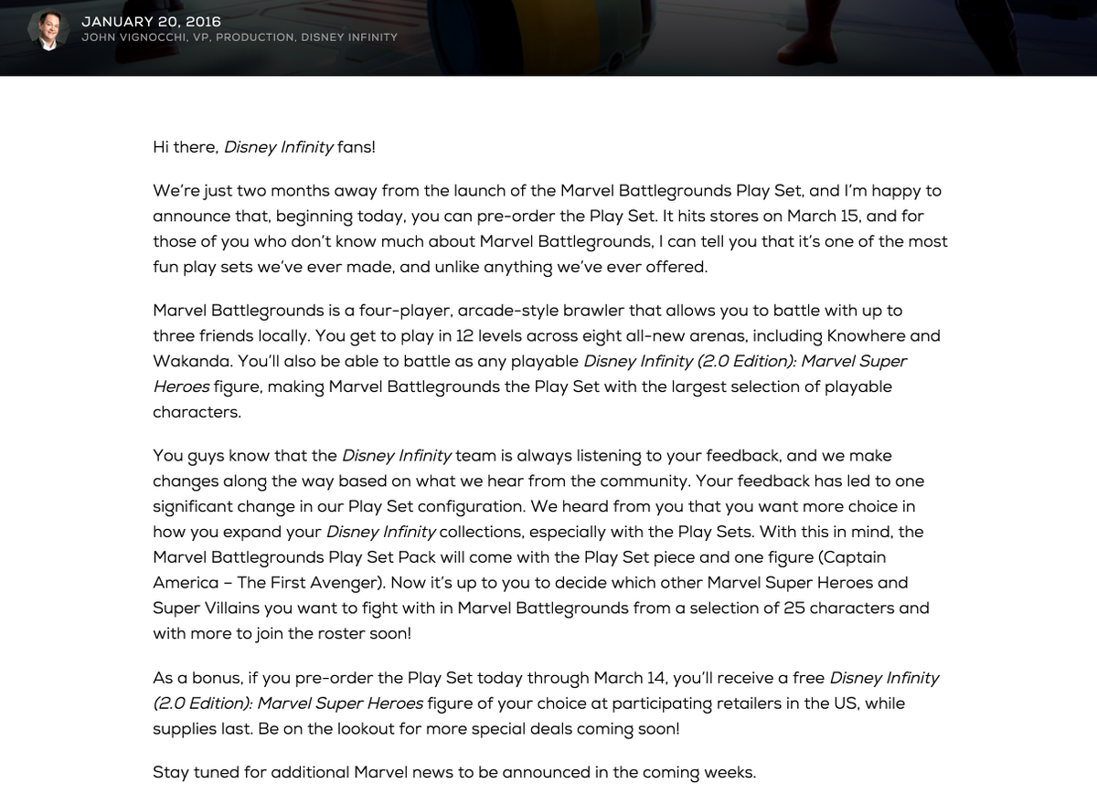 Here is @JohnVignocchi's official blog post on the Battlegrounds Play Set. More info: http://infinityinquirer.com/2016/01/20/pre-order-disney-infinity-3-0-marvel-battlegrounds-play-set-get-free-2-0-marvel-figure-at-various-retailers/ …pic.twitter.com/3pB5M5QKKH