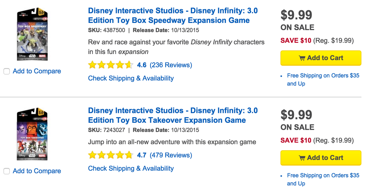 DEAL: Both #DisneyInfinity Toy Box Expansion Games 50% off -- $9.99 ea. at Best Buy Link: http://goo.gl/f6ade0 pic.twitter.com/skfk54A7b8