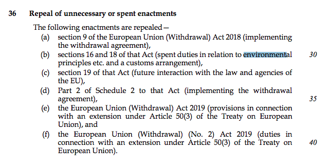 'Environment' only mentioned once in new EU Withdrawal Agreement Bill, under Section 36. No mention of environmental non-regression. WAB text: https://publications.parliament.uk/pa/bills/cbill/58-01/0001/20001.pdf#page=40 … Johnson's (vague) commitment to non-regression in September: https://publications.parliament.uk/pa/bills/cbill/58-01/0001/20001.pdf#page=40 …pic.twitter.com/q8zAWeMxFH