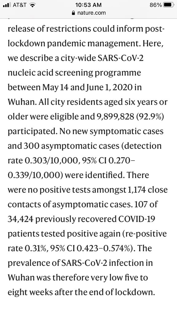1/ Incredible study just out of China that formally reports the results of mass PCR testing in Wuhan in May. ~10 million people tested, 300 positives, all asymptomatic, NONE spread the virus to close contacts. Asymptomatic spread isn’t real = masking healthy people is useless...pic.twitter.com/RKpD5FJzgi