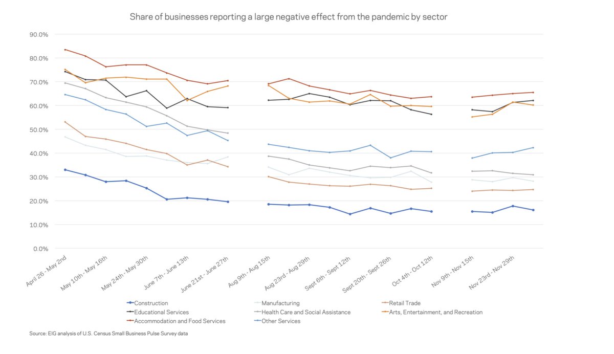(4/7) While the share of businesses reporting large negative effects from the pandemic has gradually fallen since April, some sectors remain in acute distress, like education; arts, entertainment and recreation; and accommodation and food services.pic.twitter.com/ryvZQMQOUK
