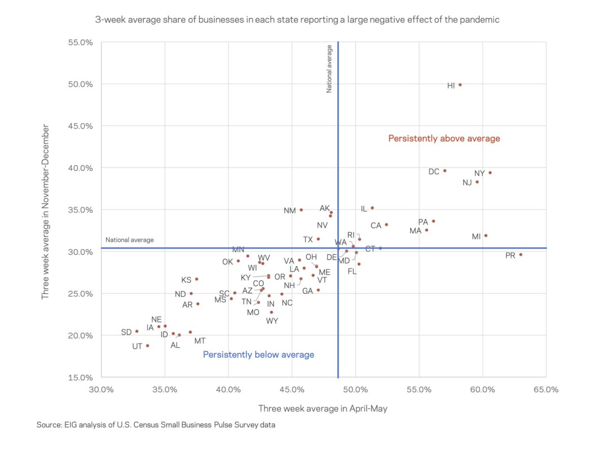 (5/7) The states where the highest share of small businesses are currently reporting the worst effects of the pandemic are generally the same that experienced the worst effects in April & May.pic.twitter.com/uDZ5MO5xWh