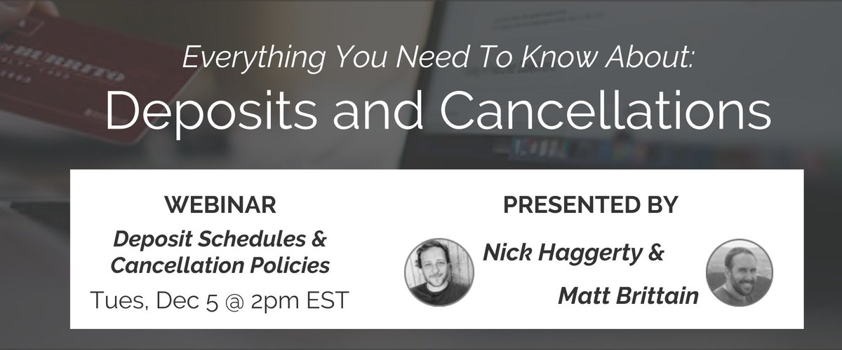 #Inntopia Webinar on Dec 5th, 2-3pm EST: Deposit Schedules and Cancellation Policies. A must!#eComm#BestPractices http://bit.ly/2nhjncX pic.twitter.com/Yx5dUeopcR