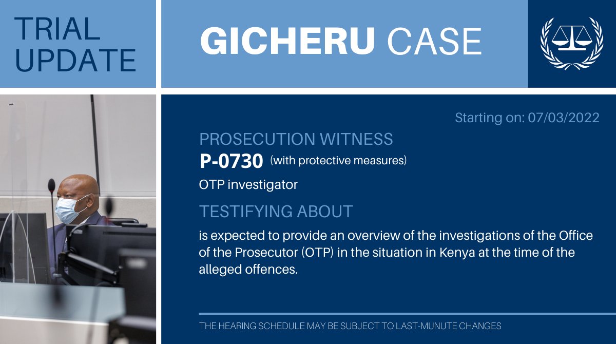 #Gicheru trial update#ICC: The 6th witness called by the Prosecution – Witness ‘P-0730’ – will start testifying on Monday