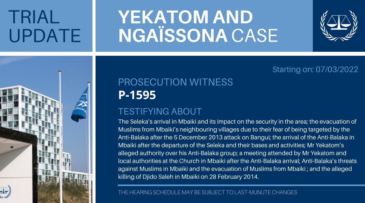 #Yekatom &#Ngaïssona trial update#ICC: The 29th witness called by the Prosecution – Witness ‘P-1595’ – will start testifying on Monday