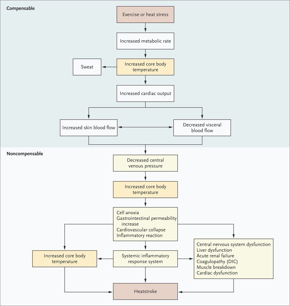 El mecanismo patogénico primario implica la transición de una compensación de la fase termorreguladora (la pérdida es > que la ganancia) a una fase NO compensable (la ganancia de calor > que la pérdida), el gasto cardíaco es insuficiente para hacer frente a la termorregulación.pic.twitter.com/yIVskVEVMB
