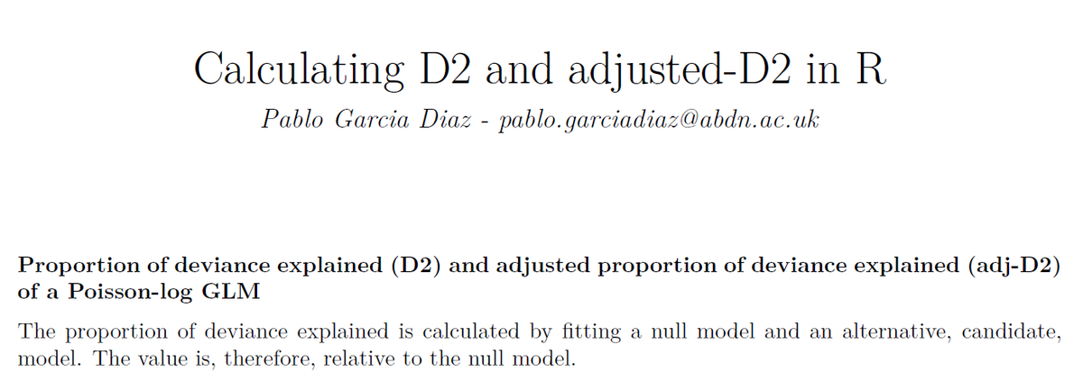 #Rmarkdown tutorial showing how to calculate the proportion of deviance explained (D2) and adjusted-D2 in R. Link for downloading the pdf: https://drive.google.com/open?id=18HxdlEQ-ToDL0DCdrcB2Y9vy_k3LRj69 … I promise it is not malware!pic.twitter.com/MPmDpX91Rh