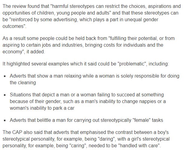 The UK advertising watchdog will ban adverts that reinforce gender inequalities! such as men struggling with, or evading, care work; & women being weak/ idiotic BOOM! This is fantastic.