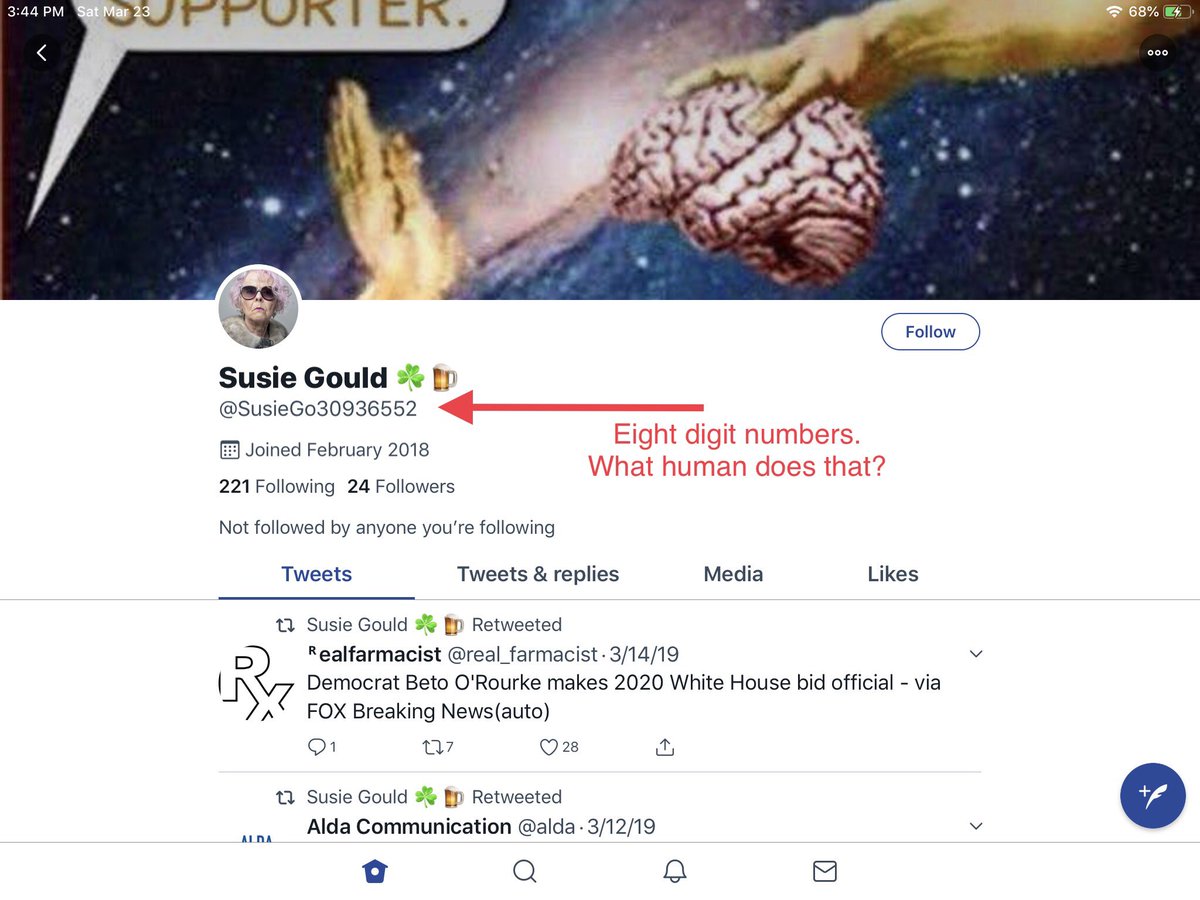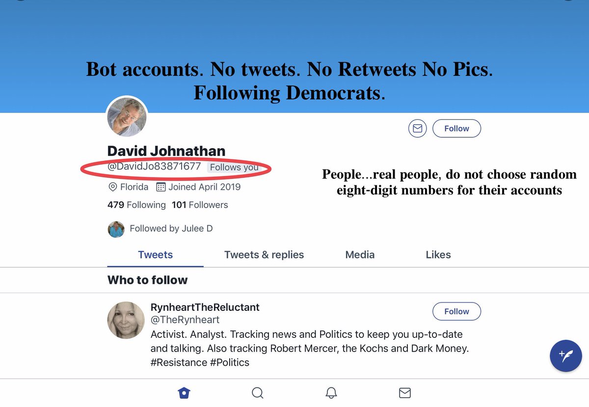 Will follow. Also want to report a possible paid, Kremlin Troll. I am going to delete all followers who look Dem. but have those numbers after their names. Some even get their names mixed up.pic.twitter.com/Cb2CBIqfHE