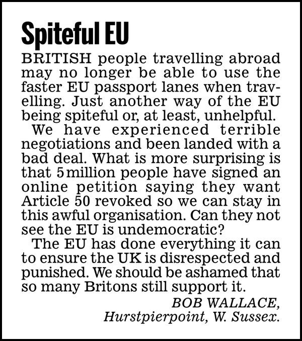 Bob there, apparently struggling with the idea that when we leave the EU, we won’t be able to access the benefits that we have as members of the EU, like passport lanes for people from EU member countries because we won’t...be in....the EU.pic.twitter.com/uG4S6zpdmL