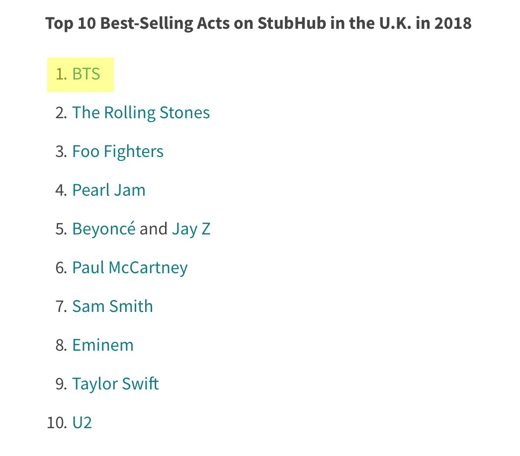 StubHub’s 2018 Year In Live Experiences Report and Video - #2 BTS- Top 10 Best-Selling Artists Around the World in 2018 - #4 BTS- Top 10 Best-Selling Acts on StubHub in Canada in 2018 - #1 BTS- Top 10 Best-Selling Acts on StubHub in the U.K. in 2018pic.twitter.com/9lUwyboFkz