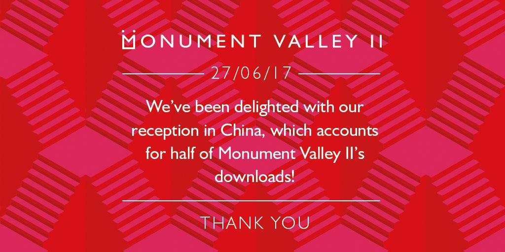 We're so happy with #MonumentValley2's reception in China, which accounts for half of our downloads on the @AppStore . Thank you! pic.twitter.com/aQvV58GA5M