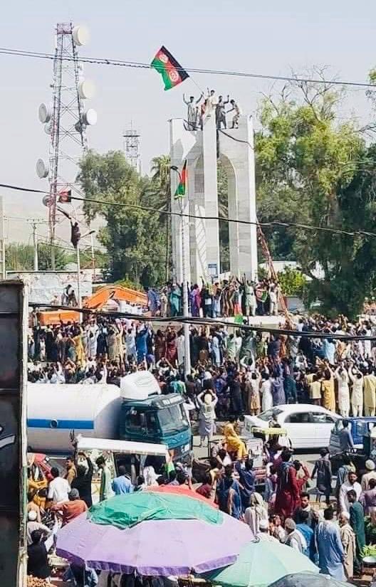Hundreds of protesters have hoisted the tri-colored Afghan National Flag in Pashtunistan square, Jalalabad. The Taliban have reportedly reacted with aerial firing at the demonstrators.