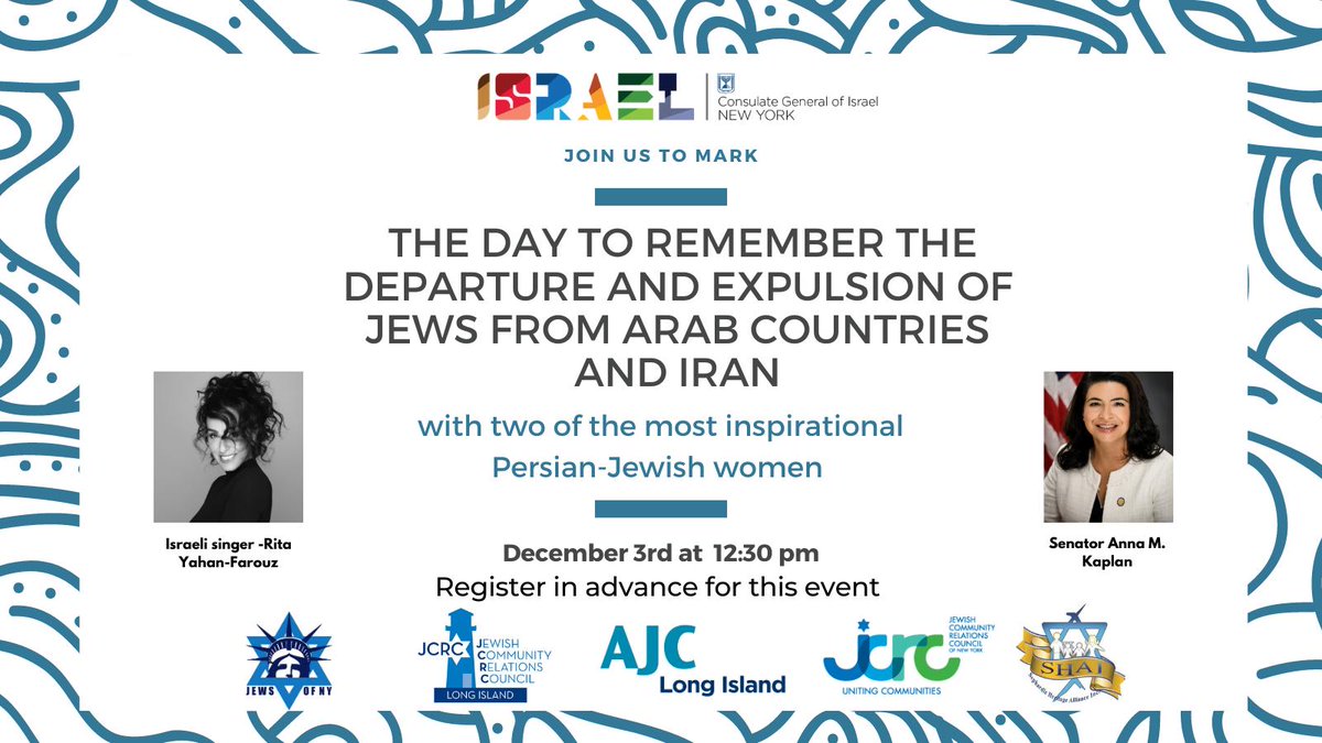 Join us on December 3rd, 2020 at 12:30PM EDT to mark the Day to Remember the Departure & Expulsion of Jews from Arab Countries and Iran with two inspirational Persian-Jewish women, Senator