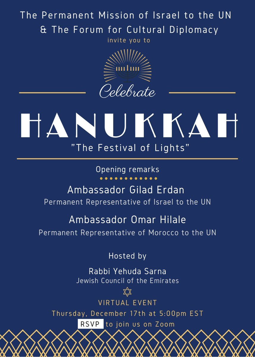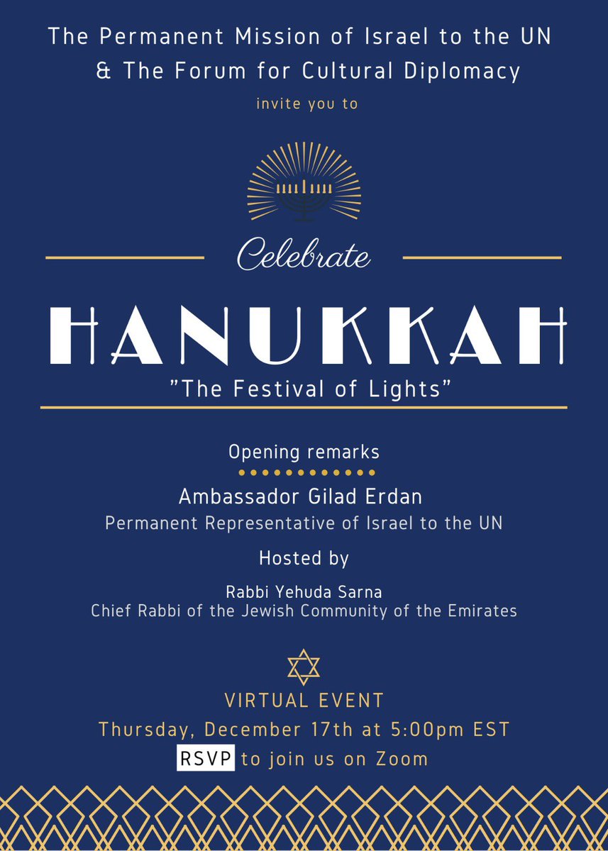 An exciting virtual Hanukkah event is coming up! Join the Permanent Mission of Israel to the UN & the Forum for Cultural Diplomacy on Thurs, Dec 17 at 5pm EST for candle-lighting featuring ambassadors from around the world! Sign up here: https://tinyurl.com/yxbvqprw
