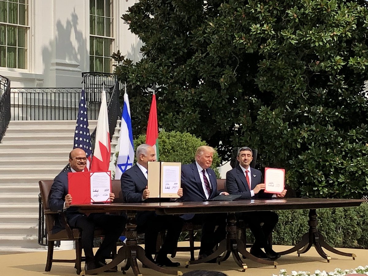#HistoryWasMade in 2020: 🇮🇱PM Netanyahu, 🇦🇪FM Abdullah bin Zayed, & 🇧🇭FM Abdullatif bin Rashid signed the 3rd & 4th Israeli-Arab peace treaties in the presence of 🇺🇸Pres. Donald Trump. May our countries enjoy many years of #peace & prosperity. #PeaceInTheMiddleEastpic.twitter.com/DhwLbd1UCp