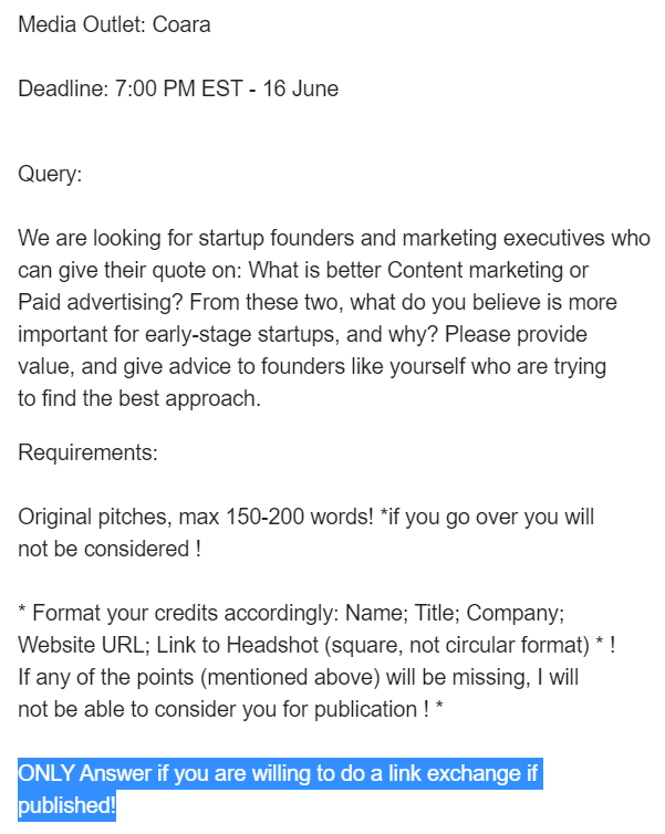 So this is a first for me on HARO. You want people to take time out of their day to contribute their expertise to your article... ...but they can ONLY answer if they're willing to do a link exchange? Ridiculous.