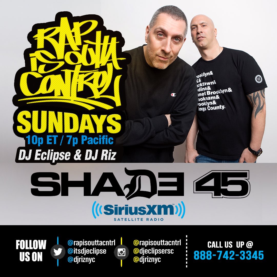 RT @RapIsOuttaCntrl: Tonight on@RapIsOuttaCntrl our guests are Madhattan, IceRocks, Pounds & Buckwild. Tune in at 10pm Eastern/ 7pm Pacific to@Shade45 with@ItsDJEclipse &@djriznycpic.twitter.com/SIhGYFwxCV