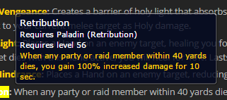 "Retribution: When any party or raid member within 40 yards dies, you gain 100% increased damage for 10 sec." LOLPALADIN