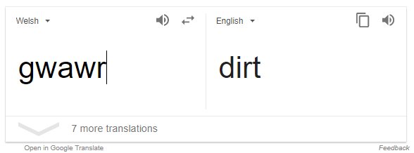 So a fairly uncommon Welsh name is Gwawr, and according to Google Translate, Gwawr is the word for warehouse, or for DIRT. (it's also apparently dawn, hue and tint and words similar, but still, naming your kid something that MIGHT be translated as DIRT amuses me)pic.twitter.com/OMSRsWLswx