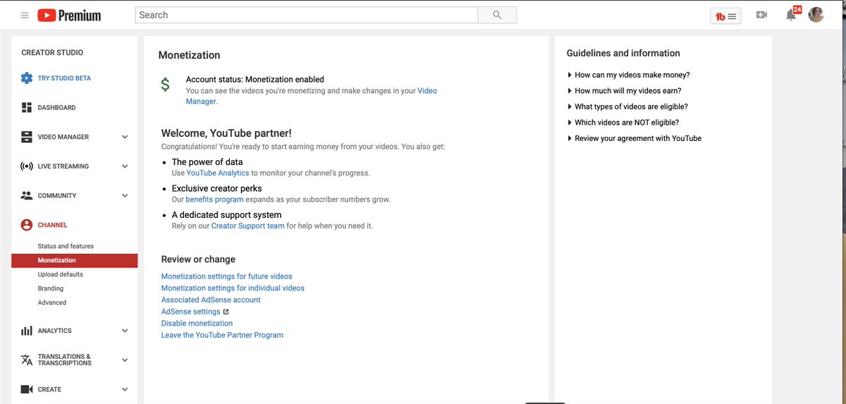 Sorry we missed your tweet. Mind sharing a screenshot of your channel's monetization page: https://yt.be/help/k2pf ? Keep us posted.