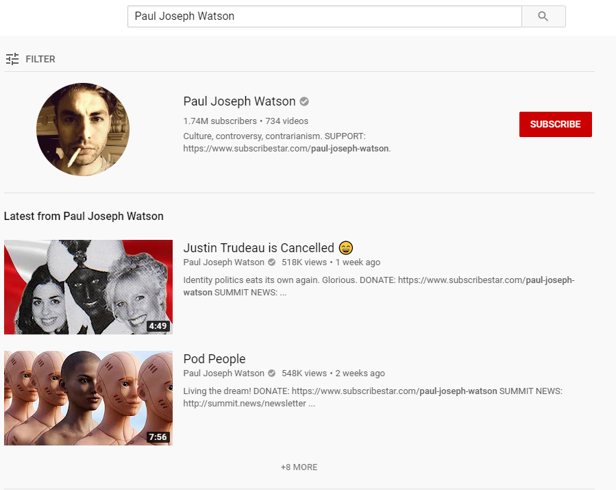 As we announced last night, @TeamYouTube has begun blacklisting right-leaning, conservative, and libertarian channels from the first page of video results leading up to the 2020 Election. Another channel affected: @PrisonPlanet https://www.youtube.com/results?search_query=Paul+Joseph+Watson&sp=EgIQAQ%253D%253D …pic.twitter.com/068LDcyrpT