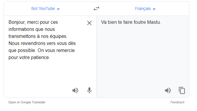 En définitif l'algorithme me démonétise à partir du moment où j'ai un quelconque son sur l'une de mes vidéos, YouTube France et US "ne peuvent rien pour moi", autrement dit je crois qu'ils me suggèrent de faire des vidéos sans sonpic.twitter.com/sPjkLGV0od