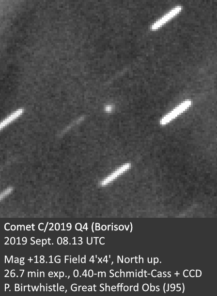 New (probably interstellar) Comet C/2019 Q4 (Borisov) on Sept. 8, showing a slightly fuzzy coma and just the hint of a tail to the top right.pic.twitter.com/TyRMWXWFv3