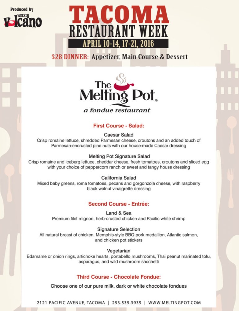 The Melting Pot is part of TACOMA RESTAURANT WEEK. See their menu and 25 more here: http://bit.ly/1WvL6gy pic.twitter.com/KgYsTpAQO5