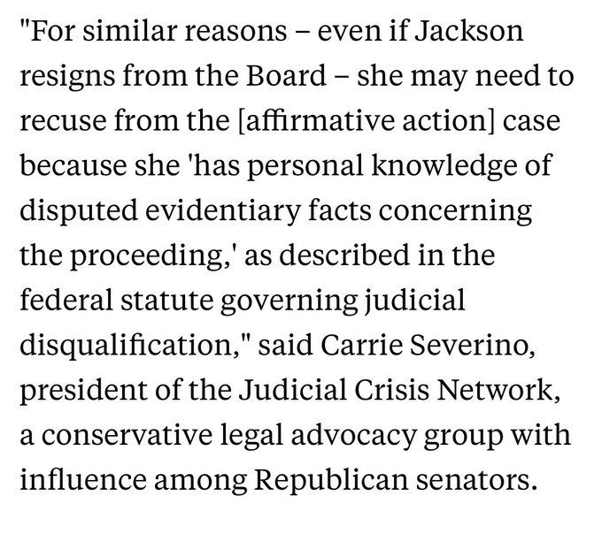 @JCNSeverino https://abcnews.go.com/Politics/ketanji-brown-jacksons-harvard-ties-scrutinized-affirmative-action/story?id=83368881 …pic.twitter.com/5QFxRvrsDj
