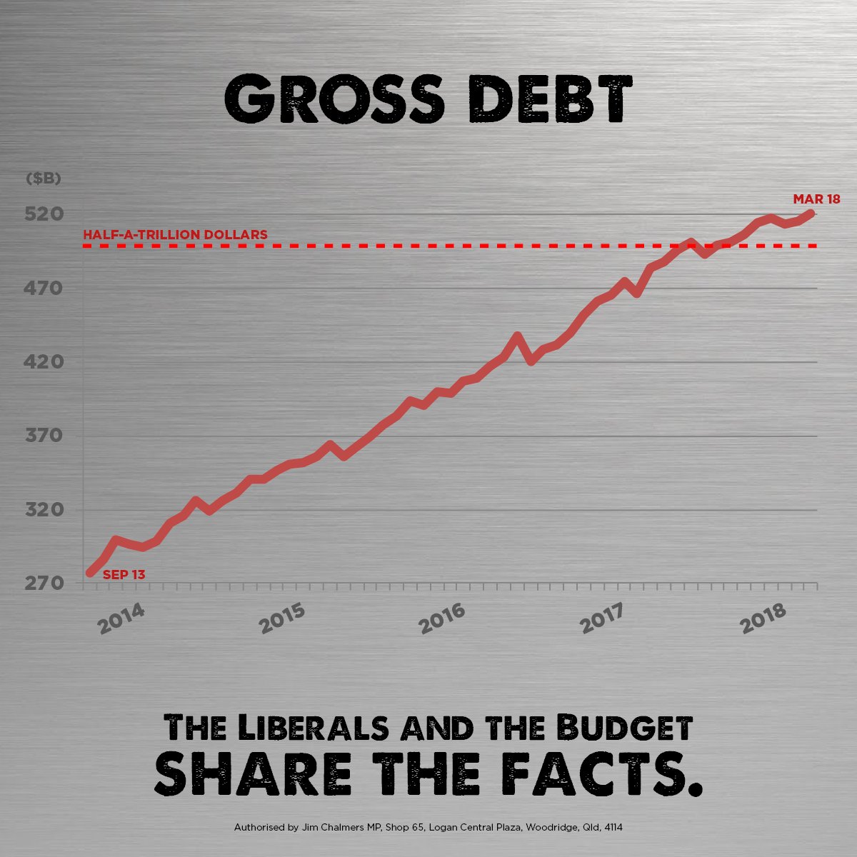 SHARE THE FACTS: Under the Liberals, gross debt has blown out by more than $243 billion, crashed through half-a-trillion dollars for the first time in the nation’s history, and is growing with no peak in sight. Think the Liberals are better economic managers? Think again.pic.twitter.com/MUs9B7lJPH