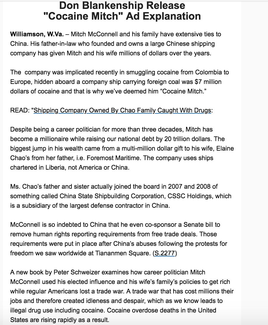 INBOX: Don Blankenship Releases "Cocaine Mitch" Ad Explanation pic.twitter.com/LwmfaAYo51