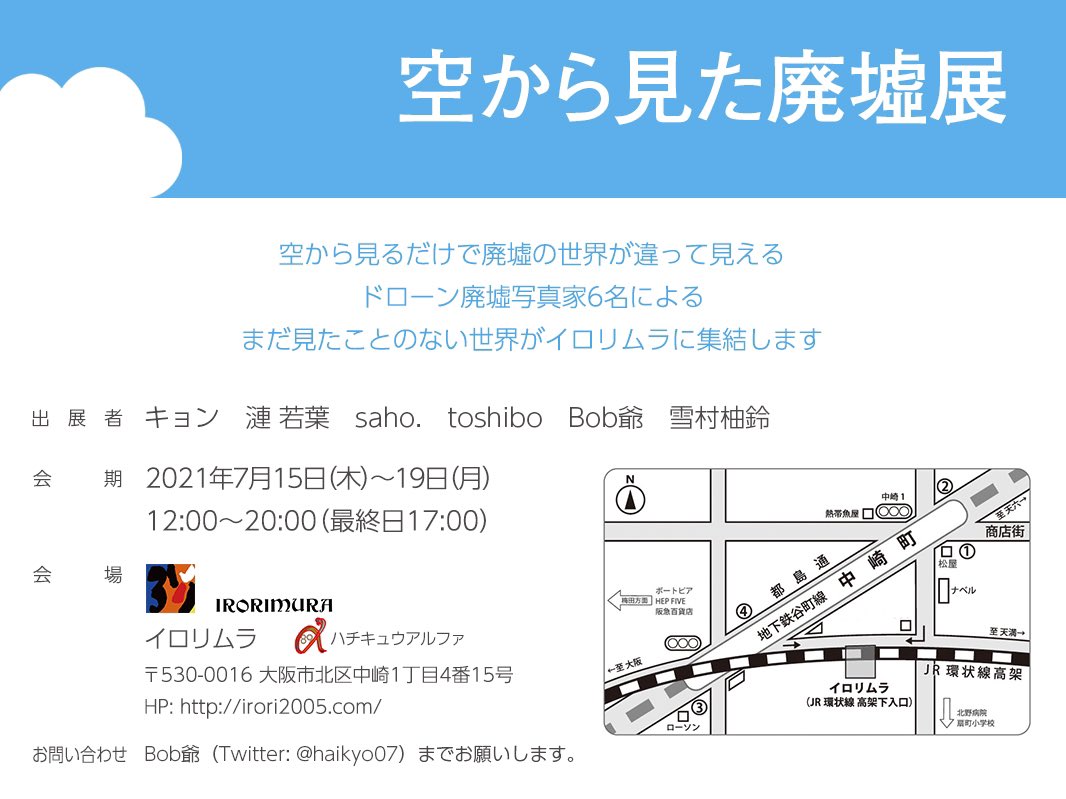 6人で廃墟写真展をやります。 空から見た廃墟展 7月15日(木曜)〜7月19日(月曜) 12:00〜20:00(最終日17:00まで) イロリムラ 89α 金・土・日は在廊予定です。