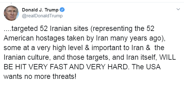 トランプ大統領は4日、イランが米国人や米国の財産に攻撃を仕掛けた場合、報復として「52カ所を標的にする。標的にはイラン文化財も含まれる」とツイート。文化財も含むとのくだりは常軌を逸している。安倍首相は中東を敢えて訪問し、両国の自制を関係国に促すべき。自衛隊派遣は火に油を注ぐだけだ。pic.twitter.com/og8gjLAVJC