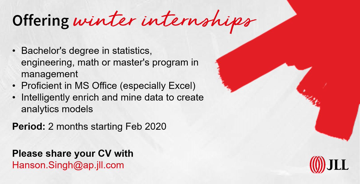 Offering winter internships to candidates with a Bachelor’s degree in statistics, engineering, math or a master’s program in management. To know more, please share your CV with Hanson Singh at Hanson.Singh@ap.jll.com