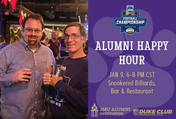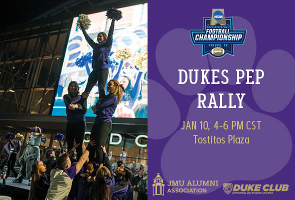 @JMUDukeClub and@JMUAlumni at the Friday Night Pep Rally! This FREE event will be held at the Tostitos Championship Plaza from 4-6pm CST! Make sure to register