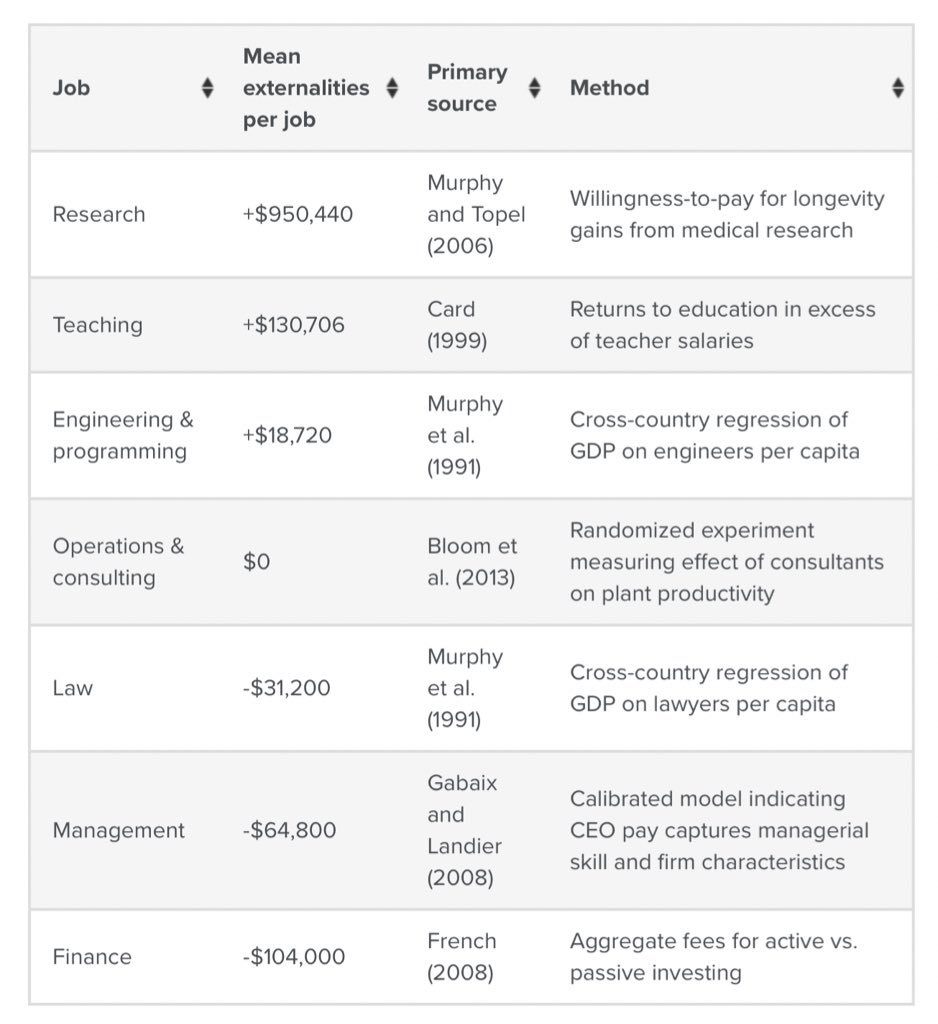 There ya go. Mean externalities is value contributed to society measured in money, because that‘s what humanity measures value in, if we/they want it or not. Source: http://80000hours.org blog post “Which professions are paid too much given their value to society?“pic.twitter.com/nUBGcSvTH0