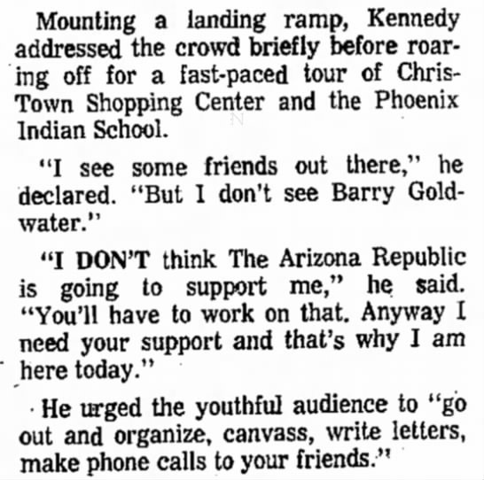 The Arizona Republic did endorse Goldwater in 1964. Everything else aside, it would have been bad for business not to. Jonathan Marshall, liberal publisher of the Scottsdale (Ariz.) Daily Progress, endorsed LBJ and lost so many local advertisers that the paper almost folded.