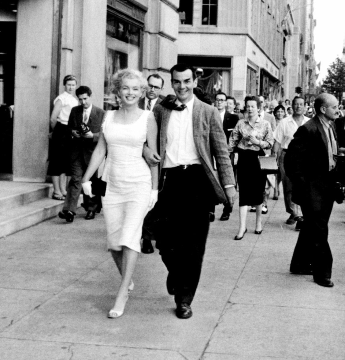 Photographed by Sam Shaw, Marilyn is striding along 5th Avenue, New York, arm in arm with LOOK magazine editor Jack Hamilton. 1957