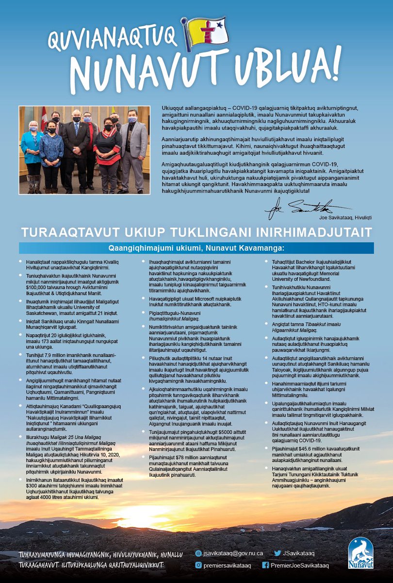 Despite COVID, I’m really happy with what we’ve accomplished over the last year. Nunavummiut, we’ve been working hard to build a stronger, better territory, with programs, services and infrastructure to help everyone.Happy