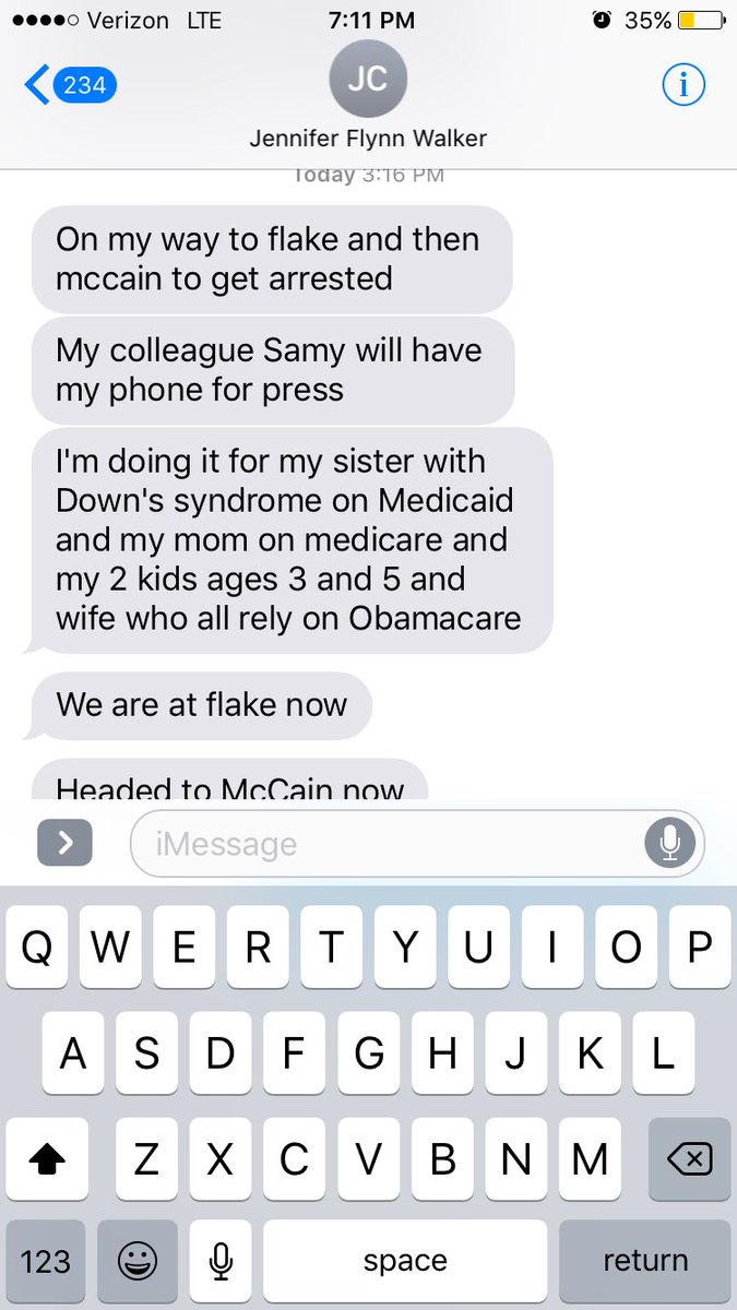 @jenniferflynn, a vital leader 4 healthcare activists, is now in police custody. Nobody has worked harder. What she texted me on her way:pic.twitter.com/OjI9mEsBOw