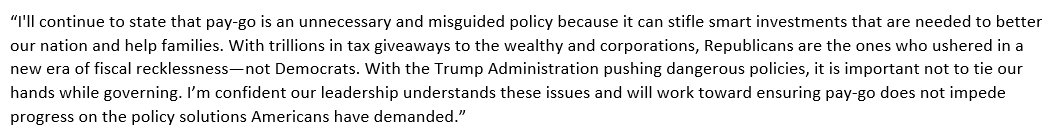 Welp, this is as close to a stake in the #PayGo fight as you can get .. @RepRaulGrijalva (D-AZ), one of most progressive members, says via spox he'll be voting for the rules package. Can't imagine a successful left revolt w/o Grijalva Also sends fuller statement opposing paygo:pic.twitter.com/Ycs2Duo4gD
