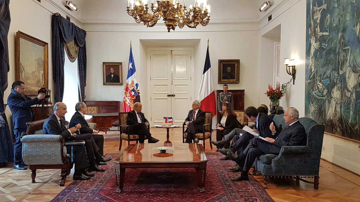 Au #Chili 🇨🇱 pour préparer le @G7 de Biarritz, la #COP25 de Santiago et approfondir nos échanges bilatéraux. Merci au président de la République @sebastianpinera et à mon homologue @TeodoroRiberaN de m’avoir reçu dès mon arrivée. _ @ChileMFA @Minrel_Chilepic.twitter.com/N8iYCK5QrJ