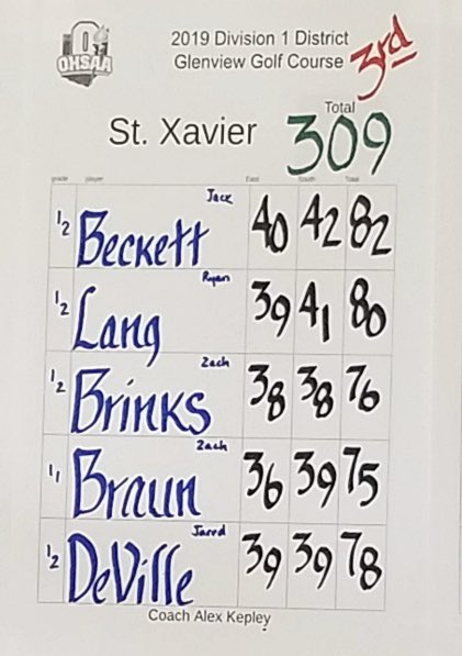State Bound! Bombers qualify for state with a 3rd place finish in Districts. Zach Braun (75) Zach Brinks (76) Jared Deville (78) Ryan Lang (80) and Jack Beckett (82) post a 309 as a team. Off to Columbus next week!pic.twitter.com/B0gcVOOus8 – mjesto: Glenview Golf Course